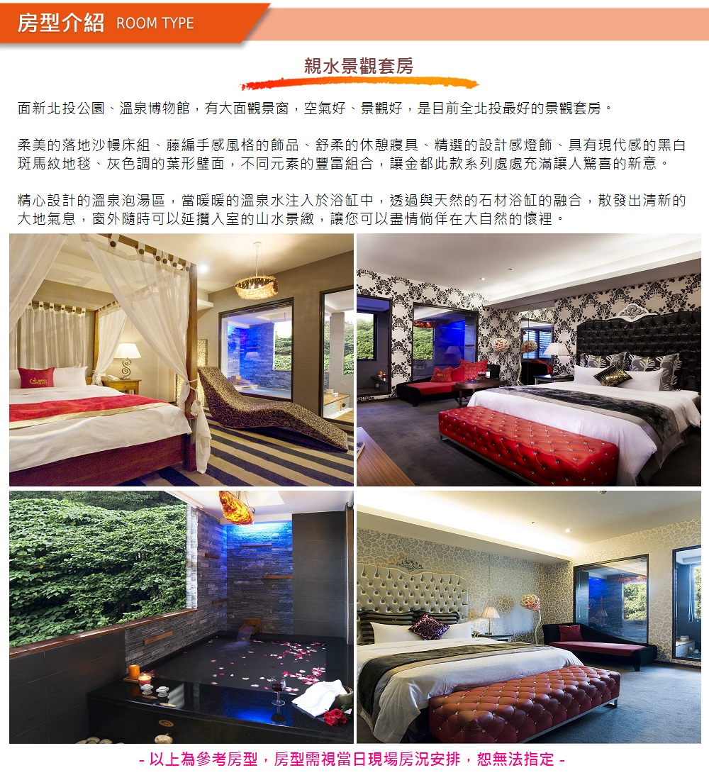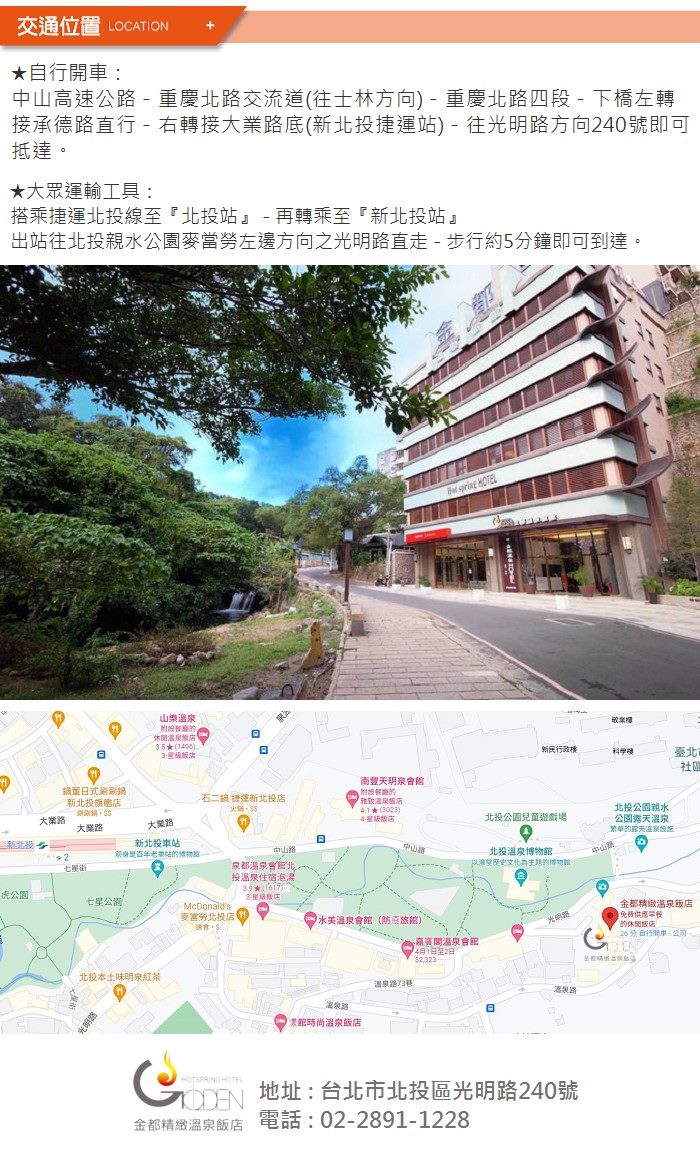 1.假日定義:週六、週日&國定例假日及前夕(含連續假期與前夕)。 2.重要節日及前夕、農曆春節期間依現場規定補價差使用。重要節日以飯店定義為主。 3.如欲升等房型須於現場加價使用。 4.如欲加時或加人使用須於現場加價使用,加時加收$500/30分鐘,加一人加收$300元(限加一人)。 5.本券恕無法與其他優惠及專案合併使用。 8.本券優惠期間等同信託期間,逾期需依現場規定補差價使用,且無法享有五~九月平日使用加贈1小時之優惠。 地址:台北市北投區光明路240號 電話:(02) 28911228