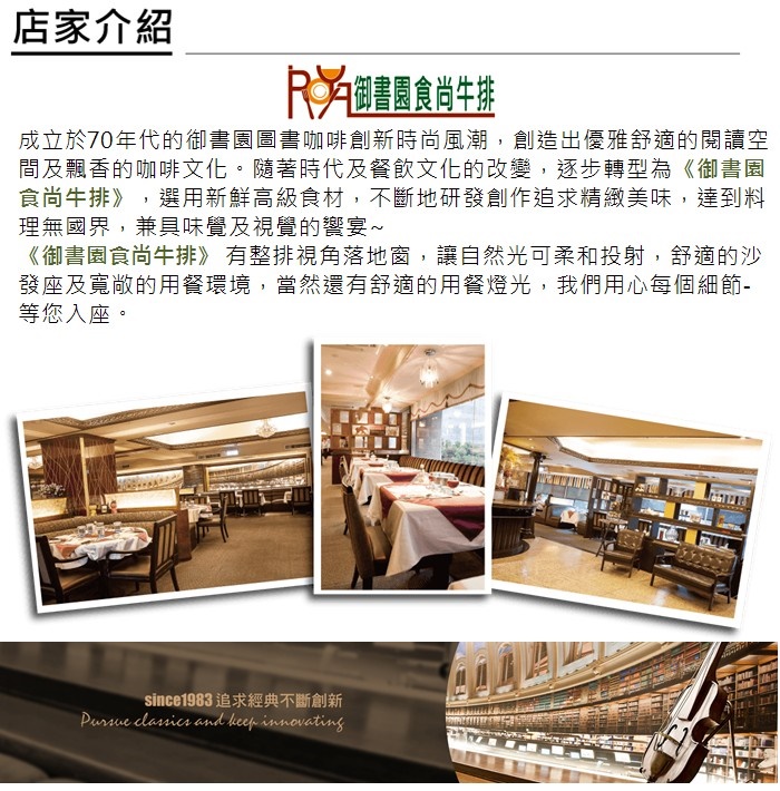成立於民國75年,至今也快將近30年了,回顧當時圖書咖啡成為一股風潮,掀起讀書咖啡文化,而隨著時代更迭及餐飲文化改變,御書園已於95年轉型為御書園食尚牛排,不變的依舊是精緻的飲食和優質的用餐環境和服務。 不敗經典的老字號西餐廳