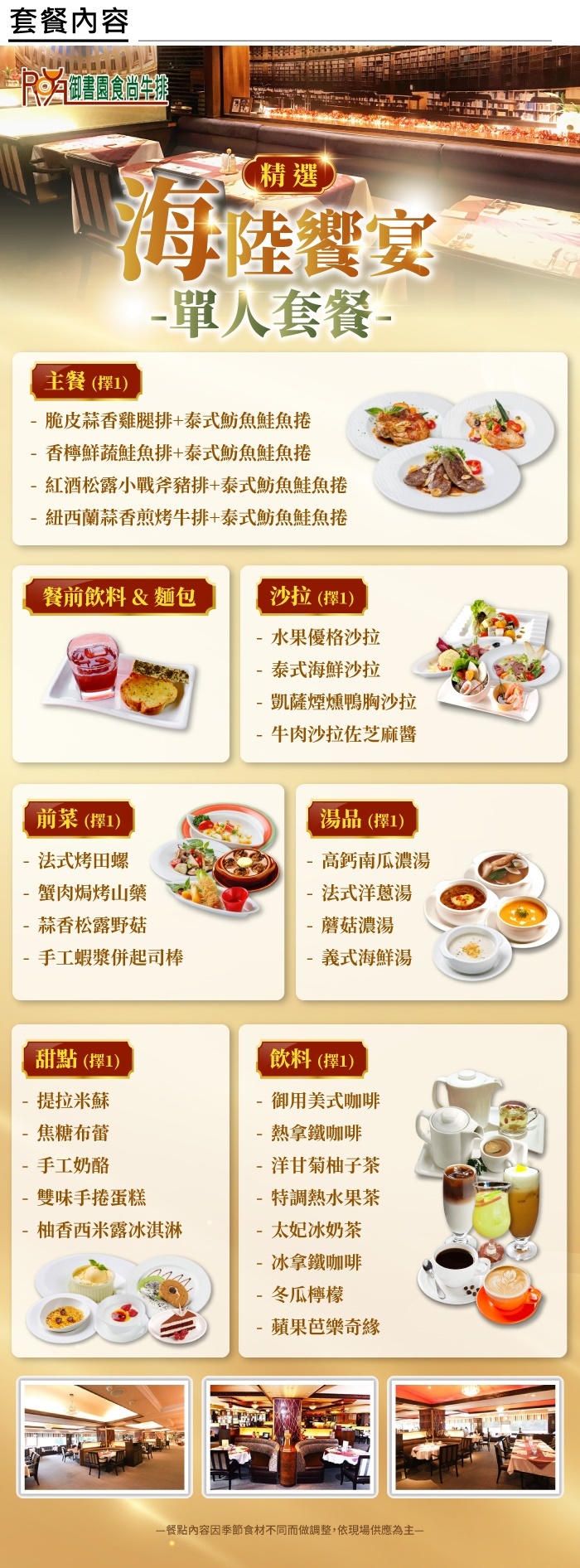 票券名稱:台北《御書園食尚牛排》精選海陸饗宴單人套餐 特價$879 | |