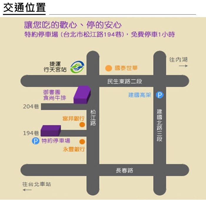 ◎使用說明: 1.本券平假日晚餐適用,假日午餐亦可使用;特殊節日(父/母親節、中/西情人節、聖誕夜/節、農曆春節期間…等)恕無法兌換,敬請於預約時確認。 2.未持券者每人最低消費$350+10%。 3.本券使用須提前完成預約,預約專線:(02)2567-5688。 4.營業時間:上午11:30~晚上10:00(點餐時間至晚上9:00,供餐時間至晚上9:30;營業時間如有調整依現場公告為準)。 5.本券恕無法與其他優惠及專案合併使用,包廂與會議室無法使用。 6.本券優惠期間同信託期間,逾期需依現場規定補價差使用。 7.如需退換本券之價金返還流程須由原購買人持原購買憑證至原購買通路酌收券面金額3%手續費辦理;亦可選擇更換其他票券。 【御書園食尚牛排餐廳】 地址 : 台北市中山區松江路206號2樓(行天宮站1號出口) 電話:(02)2567-5688 ◎注意事項: 1. 本商品(服務)禮券銷售所收取之金額,已存入發行人於銀行之信託專戶,專款專用:所稱專用,係指供發行人履行交付商品或提供服務義務使用。信託期間自禮券銷售日(以票券上記載之銷售日期為準)起算一年。 2. 本賣場票券為折扣後之優惠價使用,恕不得與其他優惠活動合併使用,敬請事先預約訂位或訂房。 3. 本賣場票券銷售時已開立代收轉付收據,使用時飯店或餐廳現場不再另行開立。 4. 本賣場標示之定價及照片僅供參考,實際以飯店或餐廳現場為準。 5. 本公司保留本賣場修改、變更及終止本活動之權利。 6. 本賣場票券經使用後即時註銷,如任意重覆使用、重製、塗改、影印、複製、偽造、散播等違法行為經查獲必移送法辦。 7. 票券依票面上之日期為有效期限,恕不受理展延,請於效期內使用完畢。 8. 本券售出如需退票,須收取原購買價格之3%手續費。 9. 寄送票券需1~5天個工作日(不含六、日及國定假日),如需近日內前往請直接於現場購票【現場購票恕不適用網路優惠】 10. 本券為有價證券遺失恕不補發,請妥善保存,結帳時請出示票券。 11. 有關票券使用未盡事宜,依各業者規定辦理。 12. 以上內容係由票券發行單位提供,如使用上有任何問題,請逕洽票券發行單位。 | |